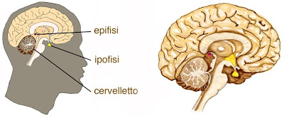Anch’essa è una ghiandola di piccole dimensioni (mezzo centimetro x 10-20 grammi di peso), posizionata al centro del cervello (fig. sotto).