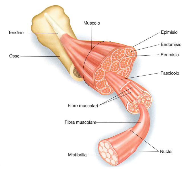All’estremità di ogni fibra muscolare, la membrana plasmatica si fonde con una struttura fibrosa che si inserisce nell’osso (o sulla pelle), questa struttura è il tendine.