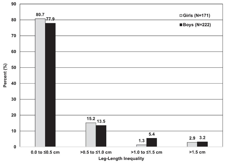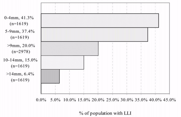 Come illustrato sopra, sempre riguardo alla differenza di lunghezza, la stragrande maggioranza di casi di LLI si ha in un range molto basso (dagli zero ai 5 millimetri). Asimmetrie un po’ più nette rappresentano una minoranza di casi (Gary A. Knutson, 2005).