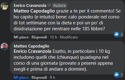N.B. Questa settimana solo allenamenti di preparazione atletica (la palestra dove da anni pratico sport da combattimento è ancora chiusa).