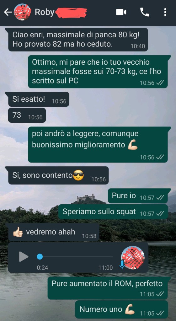 Roby, un simpatico ragazzo che seguo da un po’, ha 25 anni pratica in forma agonistica savate (boxe francese) e kickboxing/k-1. Ragazzo longilineo, dal peso che oscilla fra i 75 ed 80 kg. Dalla sua non ha una grandegenetica, infatti fatica a mettere su massa muscolare ed ha le articolazioni particolarmente fragili (predisposizione?). Però gli va riconosciuto un pregio: la grande etica del lavoro, una resilienza degna di certi atleti professionisti. Fra un acciacco al gomito, uno al ginocchio ed un altro al petto, appena riconquistata una buona condizione di salute, gli ho programmato una scheda di allenamento della durata di sole 8 settimane (due mesi circa). Per farla breve, tre sedute di allenamento coi pesi a settimana con un certo focus sui multiarticolari (distensioni su panca piana e squat). Il precedente carico massimale (1RM) sollevato alla panca piana era di 73 chilogrammi, tempo di aumentarlo, no?