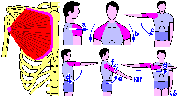 Illustrazione di alcune delle funzioni del gran pettorale: a = anteposizione dell’omero; b = abbassamento; c = adduzione e abduzione; d = adduzione sul piano sagittale; e = anteposizione (fino a circa 60°); f = intrarotazione; g = flessione orizzontale.