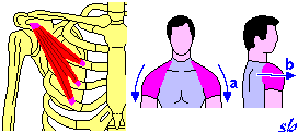 Illustrazione di alcune funzioni del piccolo pettorale: a = abbassamento dell’omero; b = anteposizione.
