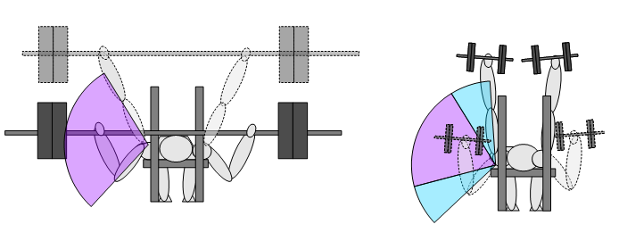Nelle croci con manubri, la massima tensione è data dalla forza di gravità, infatti quando l’omero è parallelo al suolo (figura sotto), quindi all’inizio della contrazione concentrica, la tensione è massima. Mentre è prossima allo zero, se i due manubri si trovano in alto, vicini, perpendicolari al suolo (al termine della fase concentrica).